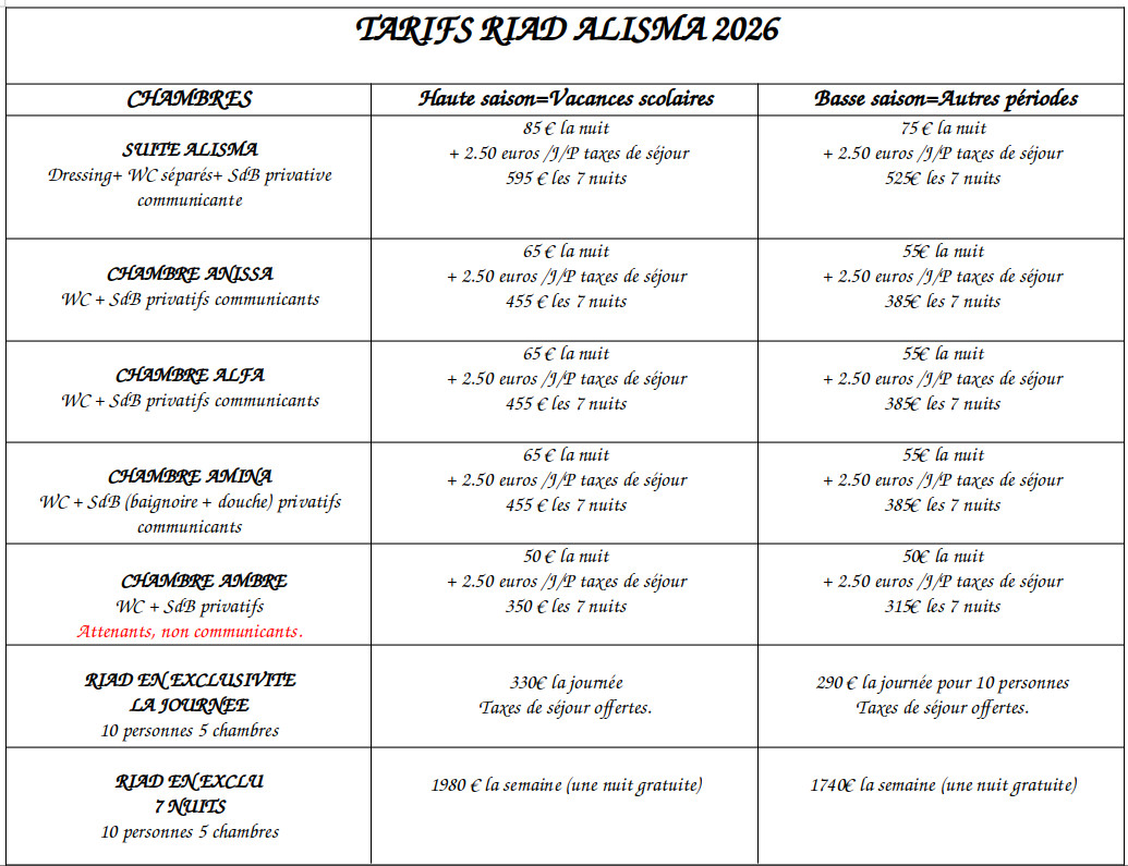 La suite Alisma est la plus grande chambre du Riad. Spacieuse et luxueuse, elle est équipée d'un dressing et aérée par un moucharabieh (une fenêtre de style oriental qui permet l'aération). La salle de bain y est attenante et communicante, tandis que les WC sont séparés.